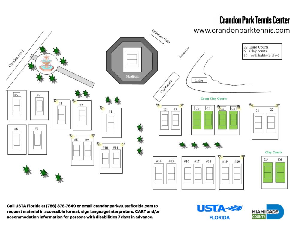 Crandon Park Tennis Center features 28 tennis courts in total on two surfaces (hard court, American green clay).